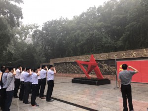 活动当天,大雨纷纷也无法阻挡党员同志们的热情,大家来到皇甫山新四军无名烈士纪念广场前,在雨中向无名烈士们鞠躬默哀,向英雄烈士们表达最崇高的敬意和缅怀之情;在鲜红的党旗下重温入党誓词,并聆听陵区管理人员讲述关于抗战期间新四军英勇反抗国民党反动派对皖东津浦路西根据地进攻的黑狼庙战役的故事。随后,大家手持白菊花来到无名烈士墓碑前向烈士们敬献鲜花并三鞠躬致敬。